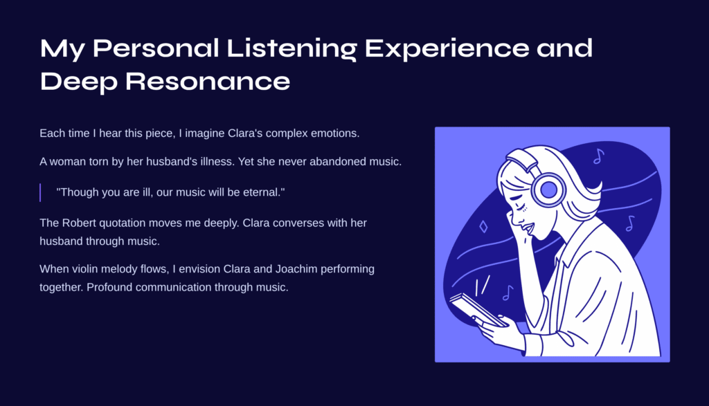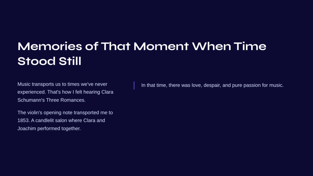 When the violin melody flows, I often envision those moments when Clara and Joachim performed together. Two musicians matching their breathing to create one beautiful piece of music. It wasn’t merely performance—it was profound communication through music.