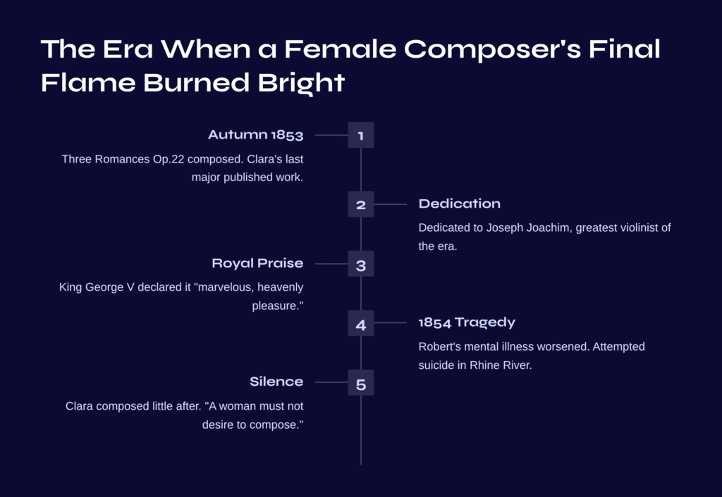 Yet behind this beautiful music lay deep sorrow. In 1854, Robert Schumann’s mental illness worsened, leading to his attempted suicide in the Rhine River. He spent the next two and a half years in an asylum before passing away. Clara composed very little after that. Her heartbreaking confession—”A woman must not desire to compose”—still pains us today.