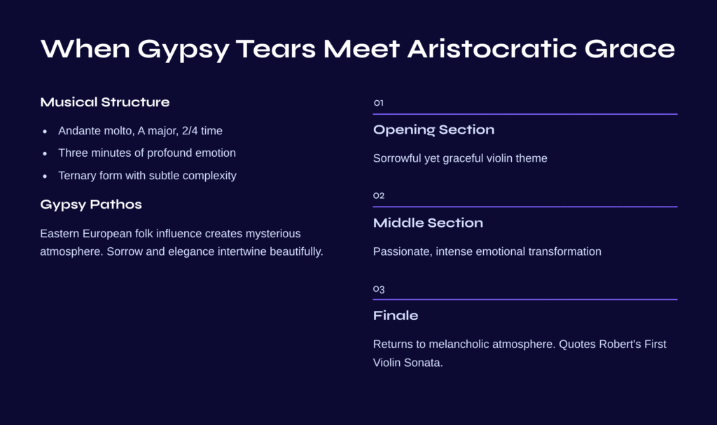 The movement’s most distinctive feature is its “gypsy pathos”—a special atmosphere influenced by Eastern European folk music, where sorrow and elegance mysteriously intertwine. Like an aristocrat’s heart refusing to lose dignity even in despair, this melody carries deep sadness while never becoming unseemly.