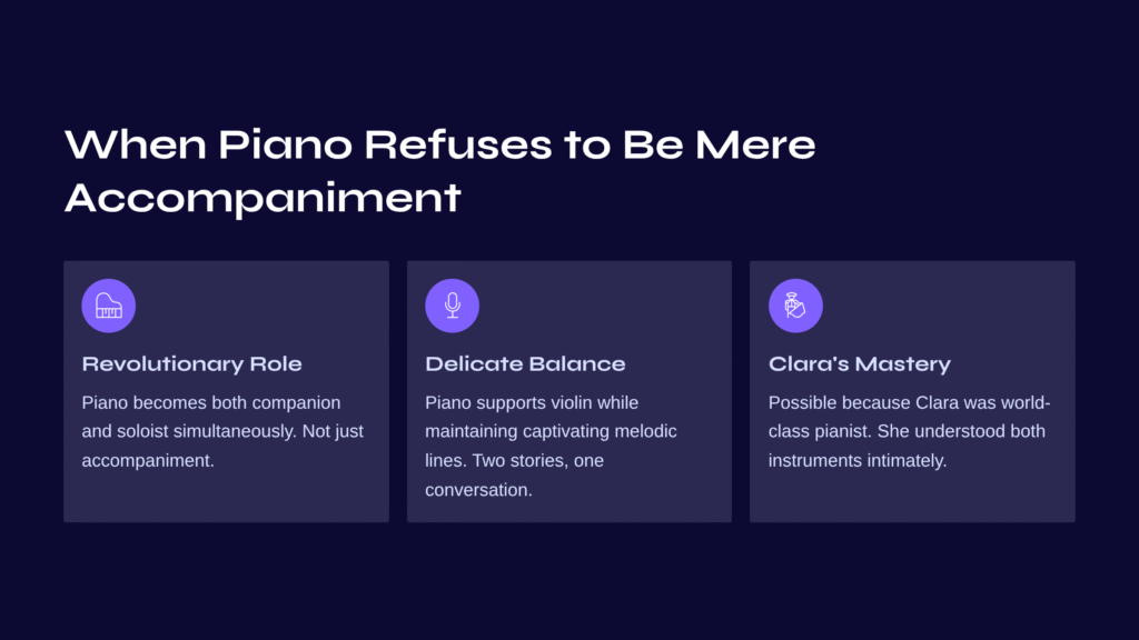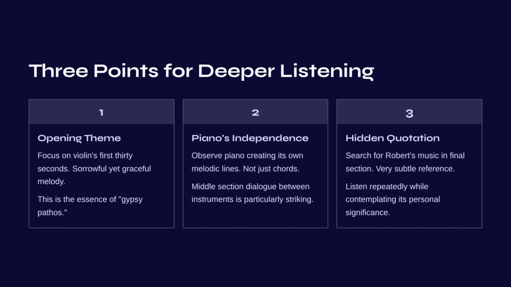 Second, observe the piano’s independent movement. Rather than simply playing chords, listen to how the piano creates its own melodic lines. The middle section, where piano and violin dialogue conversationally, is particularly striking.