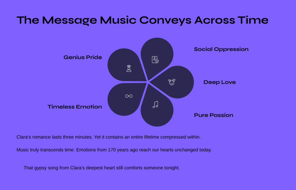 Clara Schumann’s romance lasts merely three minutes, yet it contains an entire woman’s lifetime compressed within. The pride of a genius musician, the social oppression she faced for being a woman, her deep love and concern for her husband, and above all, her pure passion for music itself.