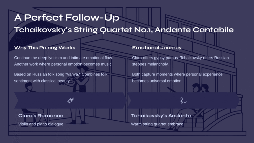 If Clara’s romance contains the sorrow of gypsy pathos, Tchaikovsky’s Andante Cantabile offers melodies steeped in the melancholy of Russian steppes. Both pieces capture moments where personal experience becomes universal emotion. Listening to them consecutively allows you to feel how lyricism from different cultures resonates within our hearts.