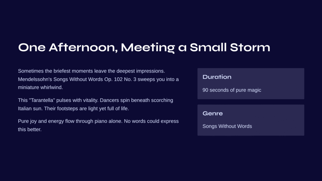 This tarantella is particularly famous for its vibrant character within Mendelssohn’s Songs Without Words collection. Unlike other songs that tend toward lyrical and introspective qualities, this piece is extroverted and dynamic. Even within the Op. 102 collection, it creates strong contrast with other pieces, functioning like sudden laughter interrupting quiet conversation.