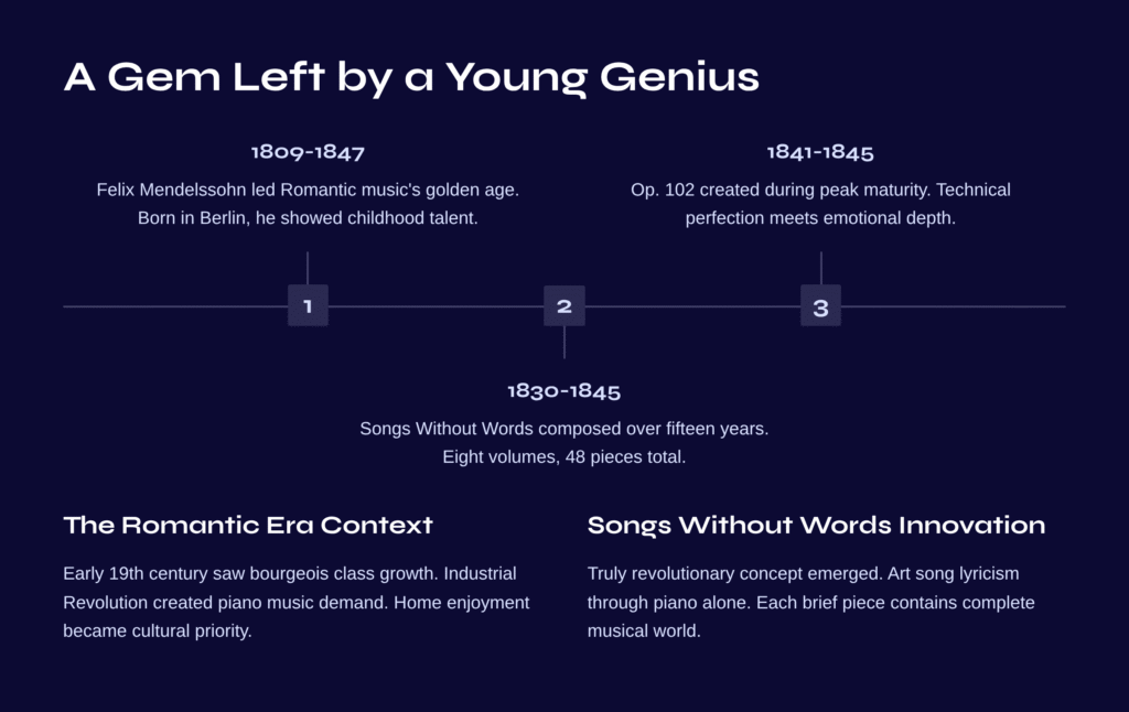 Op. 102, the final eighth volume, was composed between 1841 and 1845, during the peak of Mendelssohn’s musical maturity. This period saw the birth of works where technical perfection and emotional depth achieved perfect harmony.
