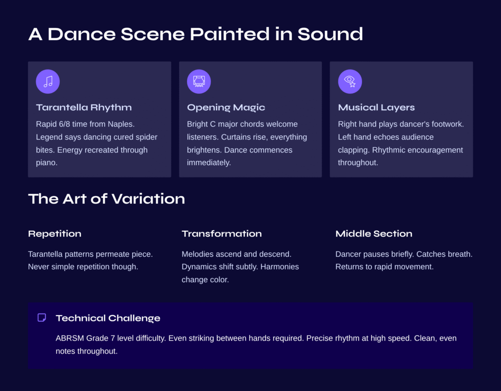 The heart of this piece lies in its tarantella rhythm. The tarantella, a traditional dance from southern Italy’s Naples region, moves in rapid 6/8 time and originates from the legend of people dancing frantically to cure spider bites. Mendelssohn perfectly recreated this legendary dance’s energy through the piano.