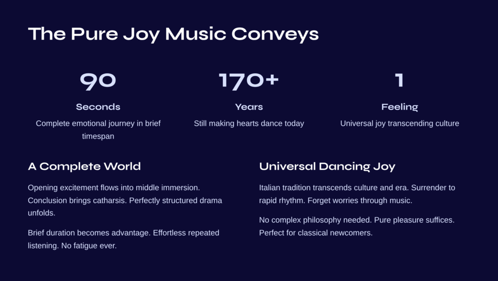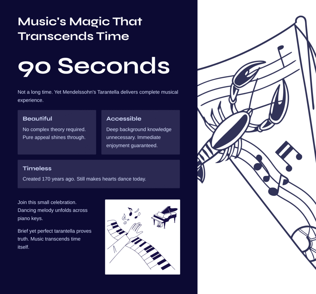 One minute and thirty seconds. Not a long time. Yet Mendelssohn’s Tarantella delivers a complete musical experience within this brief span. Beautiful and enjoyable without requiring complex theory or deep background knowledge, this work demonstrates classical music’s purest appeal.