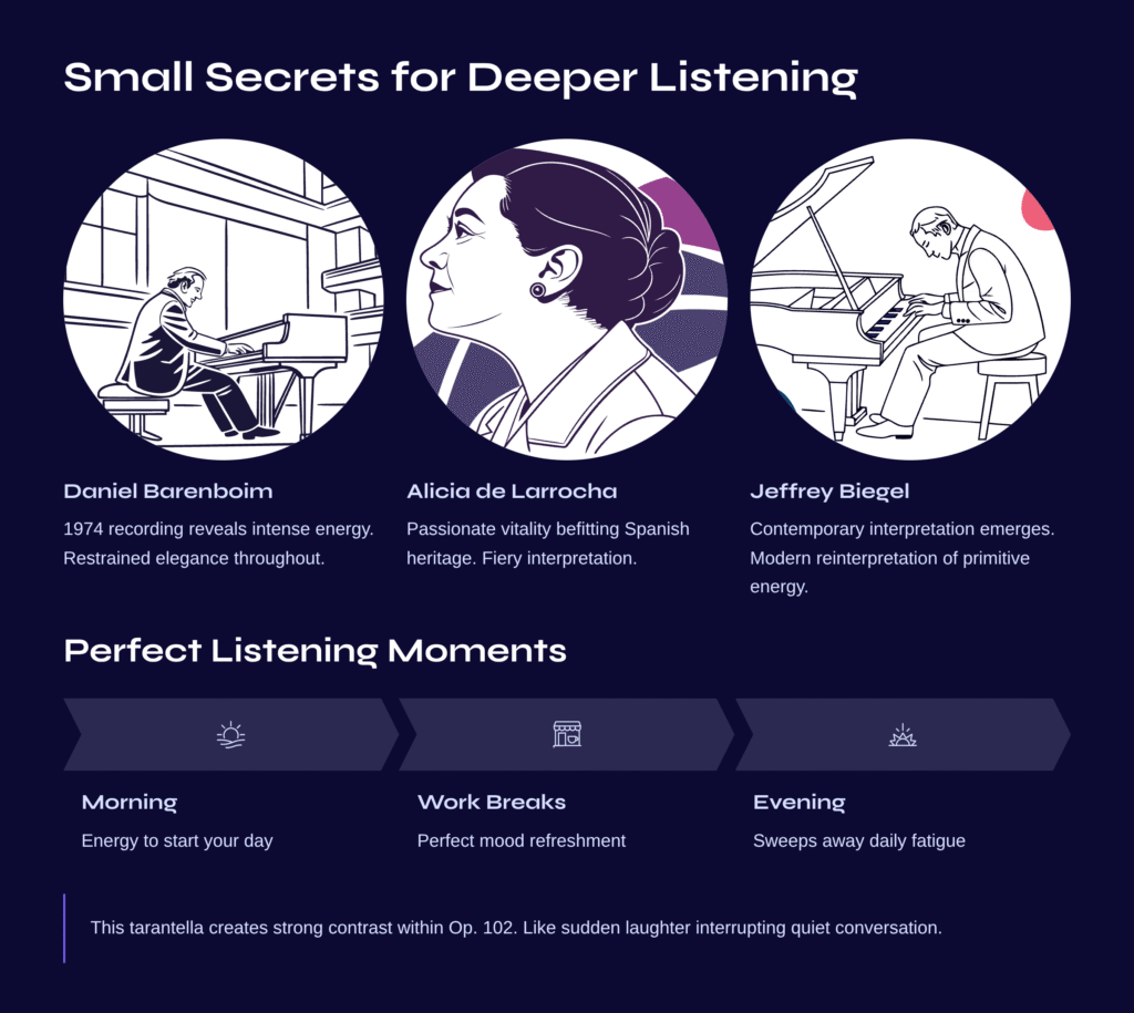 The same piece can feel completely different depending on the performer. Daniel Barenboim’s 1974 recording reveals intense energy within restrained elegance, while Alicia de Larrocha’s performance demonstrates the passionate vitality befitting her Spanish heritage. Jeffrey Biegel’s contemporary interpretation feels like a modern reinterpretation of tarantella’s primitive energy.