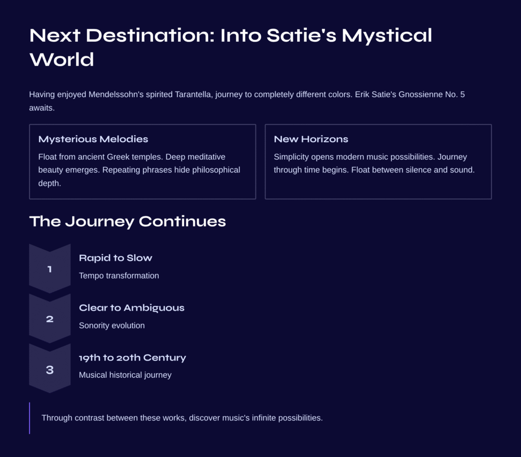 Satie’s Gnossienne resembles mysterious melodies floating from ancient Greek temples. The deep meditative beauty hidden within repeating phrases and the philosophical depth contained in simplicity opened new horizons in modern music. If Mendelssohn’s Tarantella was a vibrant dance of musical notes, Satie’s Gnossienne represents a journey through time, floating between silence and sound.