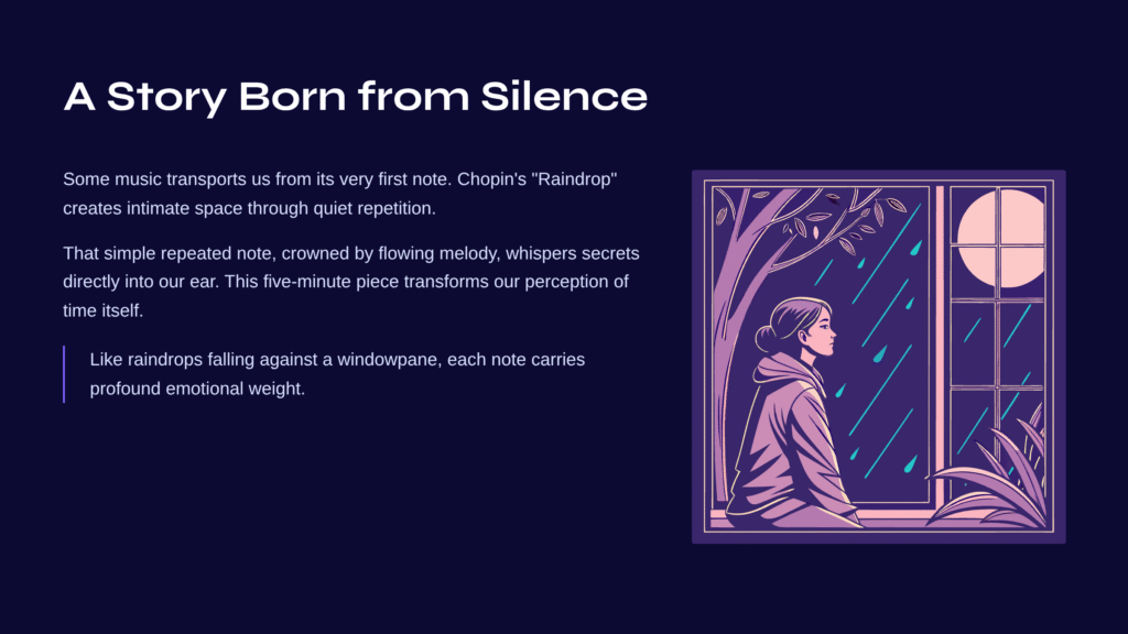 Some music transports us to another dimension from its very first note. Chopin’s Prelude Op. 28 No. 15, known as the “Raindrop,” is precisely such a piece. The moment we hear the left hand’s quiet repetition of a single note—like raindrops falling against a windowpane—we find ourselves already dwelling within the intimate space Chopin has created.