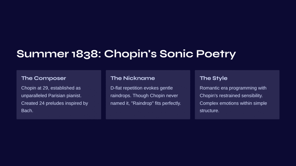 The 15th Prelude in D-flat major earned its nickname “Raindrop” because of the left hand’s persistent repetition of the note D-flat. This sound evokes the gentle patter of raindrops, hence the name. Though Chopin himself never gave it this title, it’s difficult to imagine a more fitting moniker.