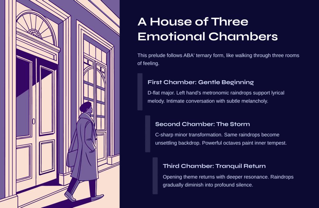 This prelude follows an ABA’ ternary form, like walking through three rooms, each revealing a different landscape of feeling.