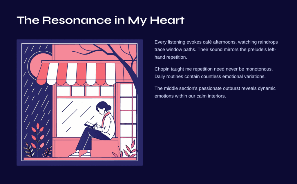 Listening to Chopin’s “Raindrop” taught me that repetition need never be monotonous. Even in our daily routines, we experience countless emotional variations. This piece’s greatest impact lies in its musical capture of such subtle everyday changes.