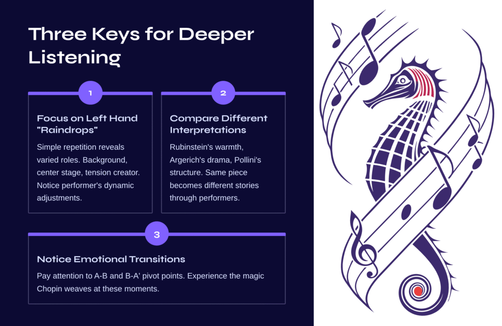 Pay special attention to the moments transitioning from A to B sections and from B back to A’. At these pivot points, you can sense the magic Chopin weaves.