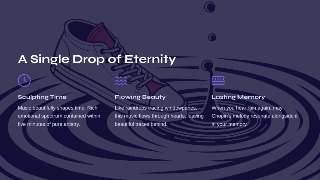 Like a single raindrop tracing its path down a windowpane, this music flows down through our hearts, leaving beautiful traces in its wake. I hope that someday, when you hear the sound of rain again, Chopin’s melody will resonate alongside it in your memory.