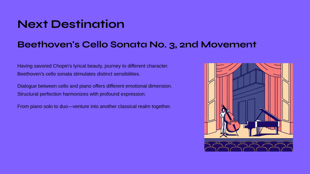 Having savored Chopin’s lyrical beauty, shall we journey to music of a different character? Beethoven’s Cello Sonata No. 3, 2nd Movement stimulates our sensibilities in ways quite distinct from Chopin.