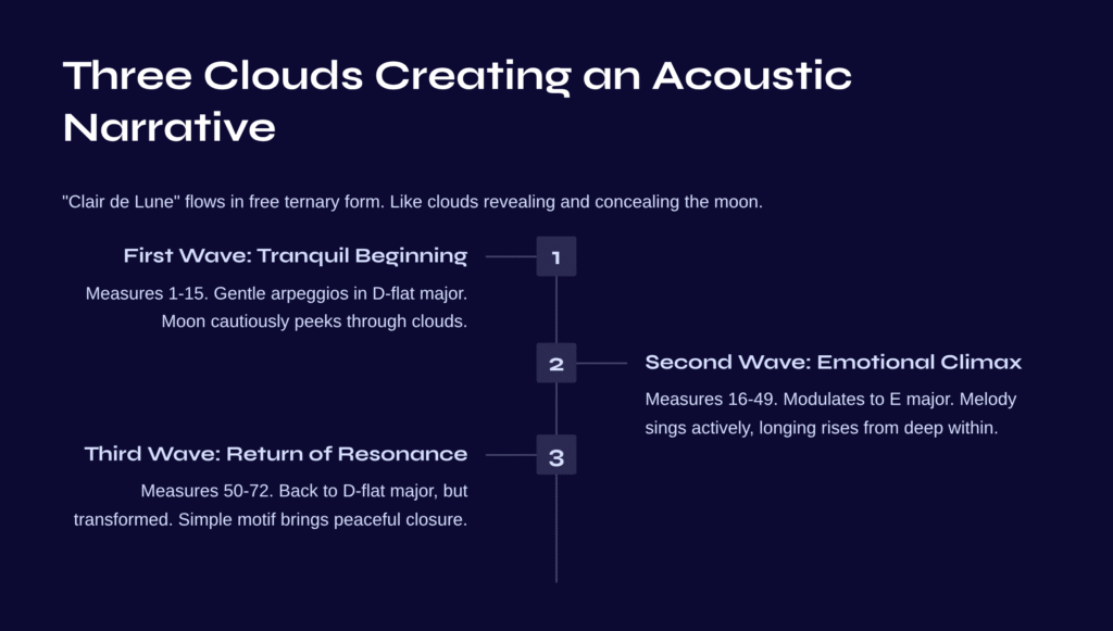“Clair de Lune” is structured in a free ternary form (A-B-A’) overall, yet it doesn’t confine itself to traditional formal constraints. Like clouds alternately concealing and revealing the moon, three great currents flow together naturally.