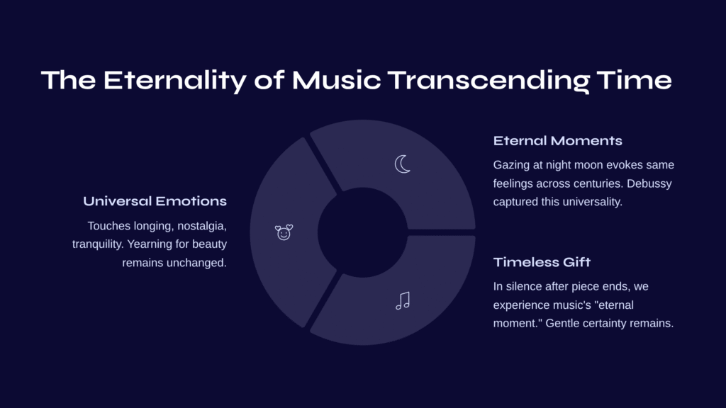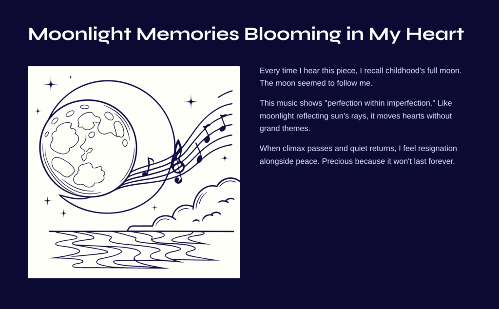 Even as technology advances and the world changes rapidly, the emotions we feel when gazing up at the moon in the night sky remain largely unchanged. Debussy captured precisely these eternal human emotions through the temporal art of music. That’s why every time we listen to “Clair de Lune,” we encounter some universal beauty that transcends time and space.