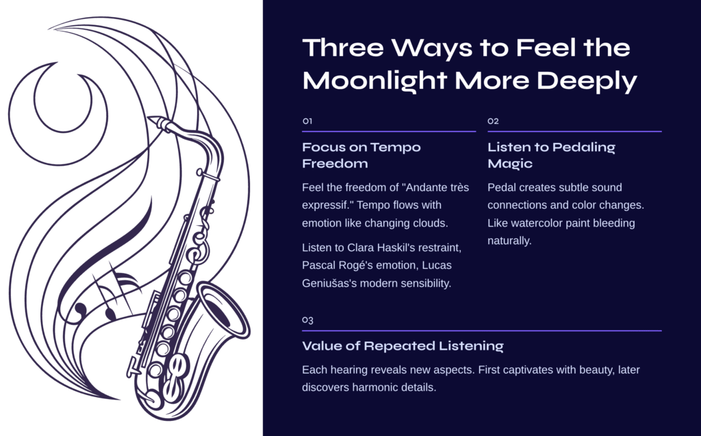 The most important aspect when appreciating “Clair de Lune” is feeling the freedom of tempo. While Debussy marked the score “Andante très expressif” (moderately slow and very expressive), the tempo actually flows freely according to the performer’s interpretation. Like clouds changing shape with the wind, this piece’s tempo also shifts with emotion.
