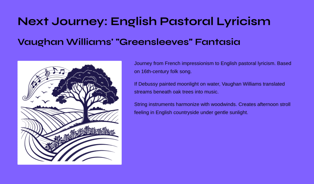 How about embarking on a journey from Debussy’s French impressionism to English pastoral lyricism? Ralph Vaughan Williams’ “Fantasia on Greensleeves” is an orchestral work based on a 16th-century English folk song that offers a different charm from “Clair de Lune.”