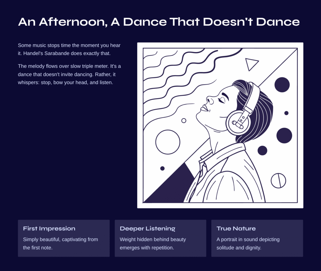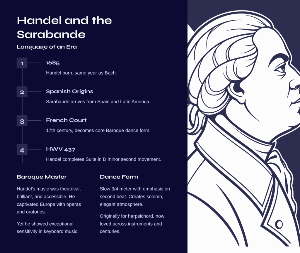 The Sarabande originally came from Spain and Latin America, and after passing through the French court in the 17th century, established itself as a core Baroque dance form. Characterized by a slow 3/4 meter with emphasis on the second beat, it creates a solemn and elegant atmosphere. Handel reinterpreted this form in his own way, completing it as the second movement of his Keyboard Suite in D minor, HWV 437.
