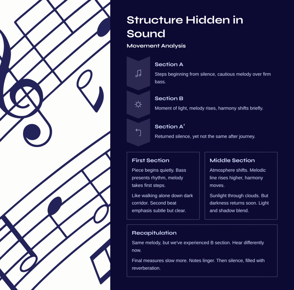 The piece begins very quietly. The bass slowly but firmly presents the rhythm, and above it the right-hand melody cautiously takes its first steps. It feels like someone walking alone down a dark corridor.