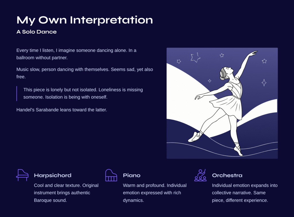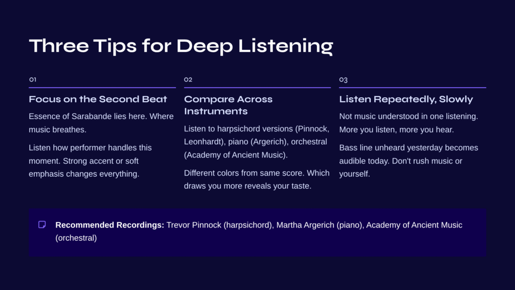 The essence of the Sarabande lies in the second beat. That’s where the music breathes. Listen carefully to how the performer handles that moment. Some give it strong accent, others emphasize it softly. That difference completely changes the piece’s character.
