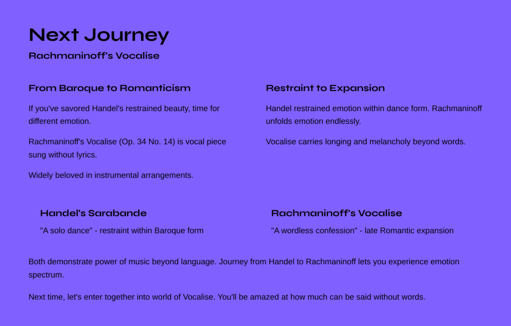 If Handel’s Sarabande was “a solo dance,” Rachmaninoff’s Vocalise is “a wordless confession.” Both demonstrate the power of music beyond language. The journey from Handel to Rachmaninoff will let you experience a spectrum of emotion moving from Baroque to Romanticism, from restraint to expansion.