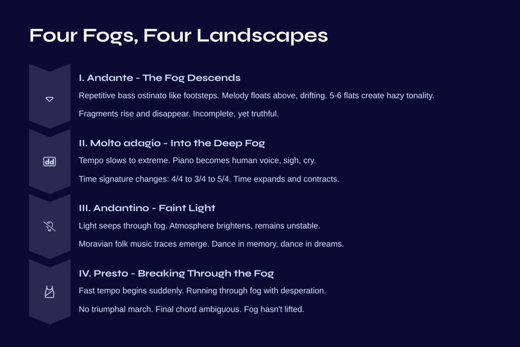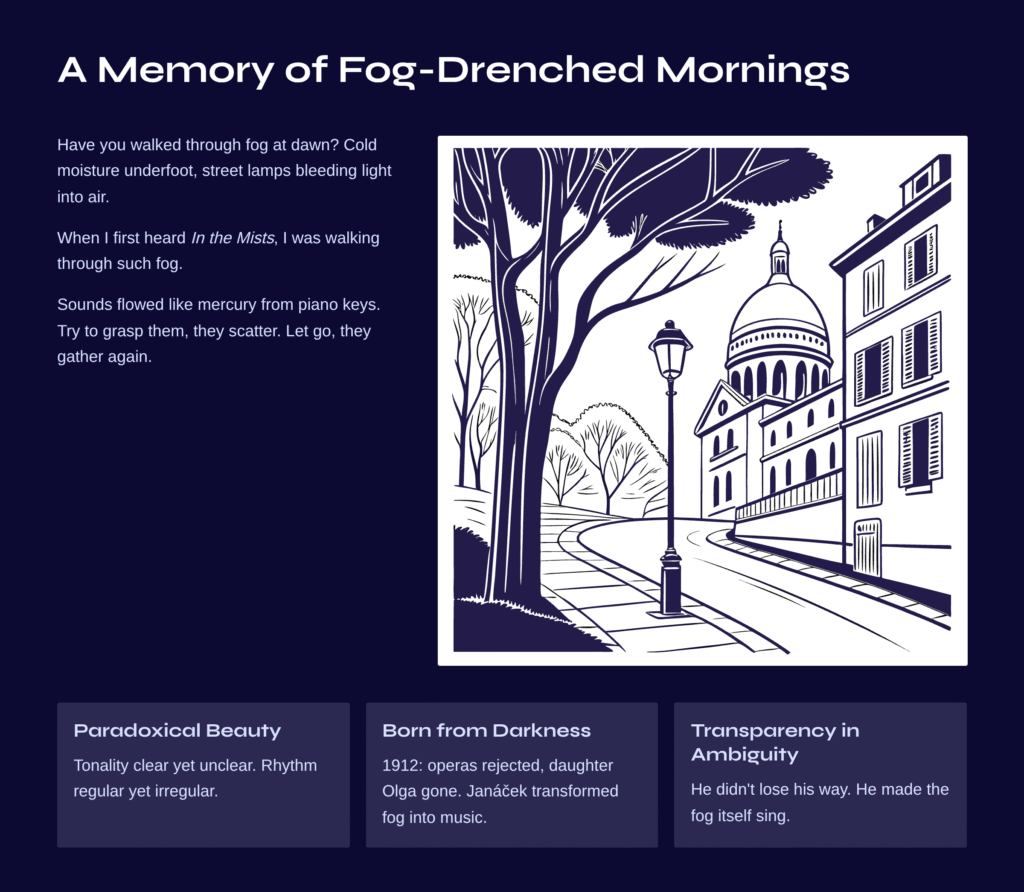Have you ever walked down a fog-shrouded road at dawn? The cold moisture beneath your feet, the street lamps bleeding their light into the air, the sound of footsteps that may or may not be there. Everything is blurred, yet simultaneously too vivid. When I first heard Janáček’s In the Mists (V mlhách), I was walking through such fog.