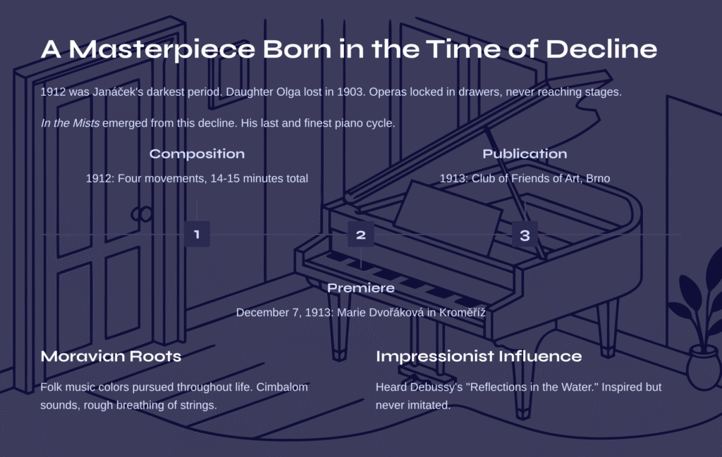 The year 1912, when Leoš Janáček composed In the Mists, was one of the darkest periods of his life. The shadow of losing his daughter Olga in 1903 still weighed heavily on his heart, and the operas he had poured his soul into remained locked in drawers, never reaching the stage. This piano cycle was born precisely from such a period of personal decline.