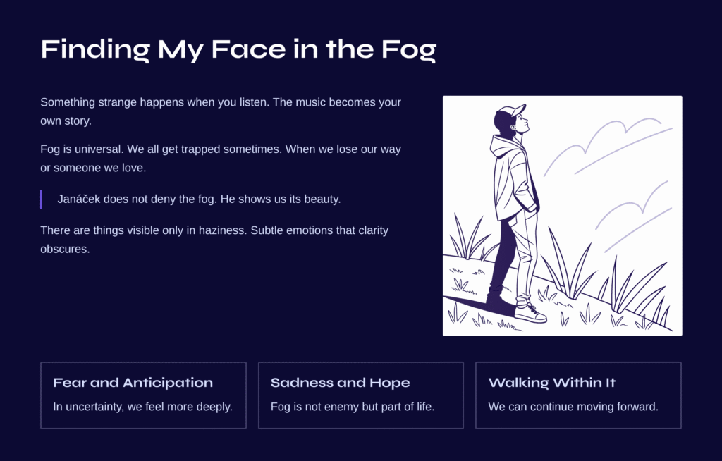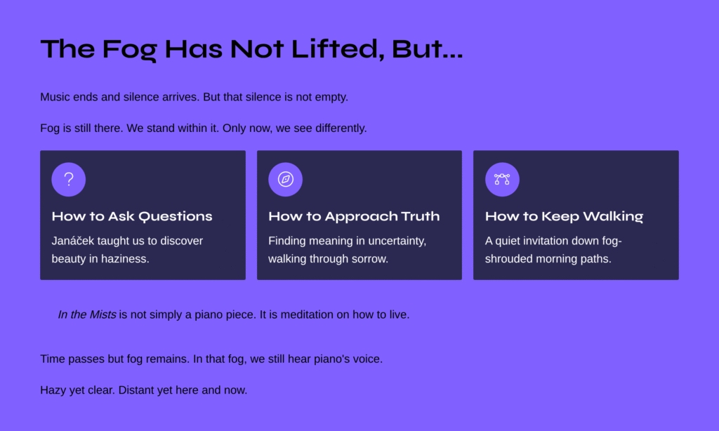 While listening to this piece, I recalled a moment from several years ago. When I was lost before a major decision. Everything was uncertain, the future as hazy as fog. But in that uncertainty, I actually felt more. Fear and anticipation, sadness and hope. This is what Janáček’s piano speaks of. That fog is not an enemy but part of our lives, that we can continue walking within it.