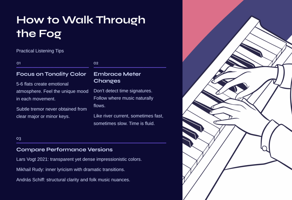 Third, compare different performance versions. Lars Vogt’s 2021 recording maximizes impressionistic colors with transparent yet dense sonorities. Mikhail Rudy balances inner lyricism with dramatic transitions, while András Schiff elegantly unfolds structural clarity and folk music nuances. Experiencing how the same score creates different fogs with different performers is itself a journey.