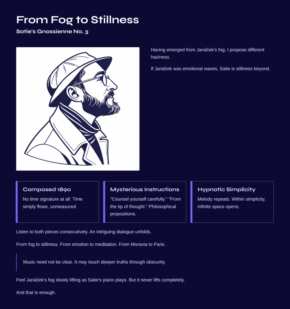 The melody of Gnossienne No. 3 is simple. It repeats almost hypnotically. Yet within that simplicity, infinite space opens. If Janáček found emotion in fog, Satie finds existence in stillness. Both composers rejected clarity and chose ambiguity, but they arrived at different places.