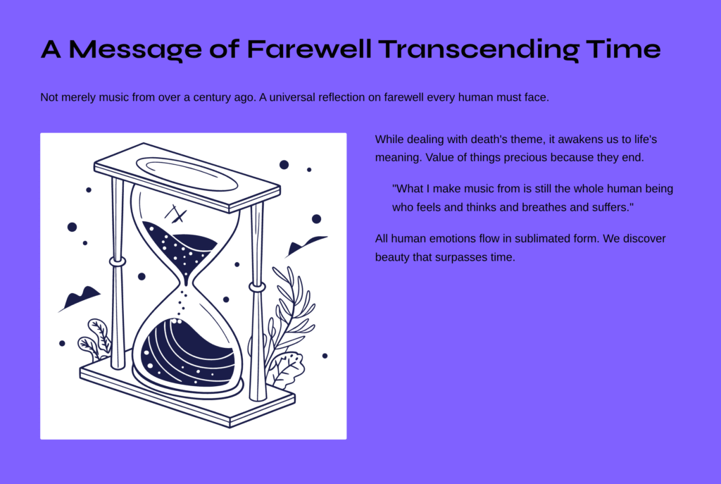 Mahler’s Symphony No. 9, fourth movement, is not merely music from over a century ago. It is a universal reflection on the farewell that every human must someday face. While dealing with the theme of death, it ultimately awakens us more deeply to the meaning of life.