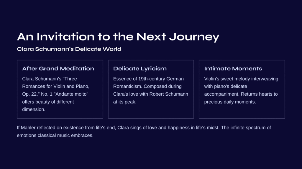 After completing Mahler’s grand meditation on death, I would like to invite you to beauty of an entirely different dimension. Clara Schumann’s “Three Romances for Violin and Piano, Op. 22,” No. 1 “Andante molto,” in contrast to Mahler’s sublime tragedy, embraces us with delicate and intimate lyricism.