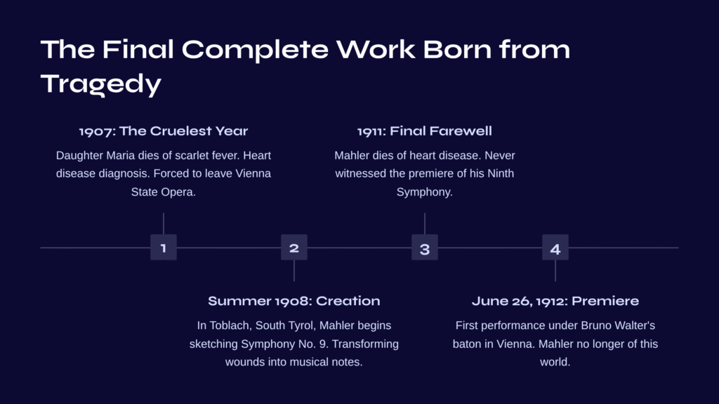 Yet paradoxically, from this extreme suffering emerged his most sublime work. In the summer of 1908, in Toblach, South Tyrol, Mahler began sketching his Symphony No. 9. As if transforming his wounds into musical notes, he poured everything into this composition.