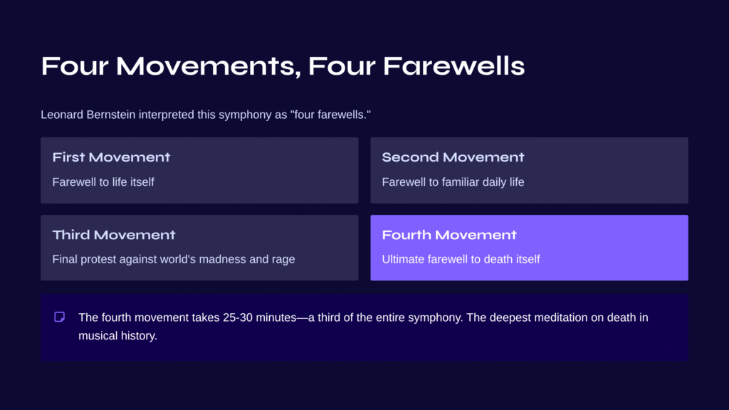 The fourth movement, in particular, takes 25-30 minutes—a third of the entire symphony—to depict not merely death, but the process of reconciliation with death. This can be called the deepest meditation on death in musical history.
