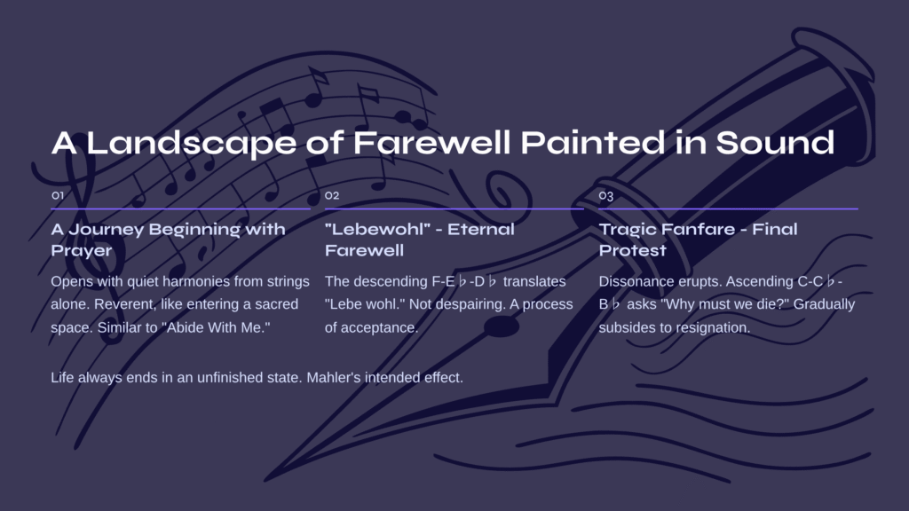 In the middle section, a “tragic fanfare” filled with dissonance suddenly erupts. This ascending motif of C-C♭-B♭ sounds like a final protest: “Why must we die?” Here the music becomes momentarily violent, with anger and despair exploding in a mixture of emotions.