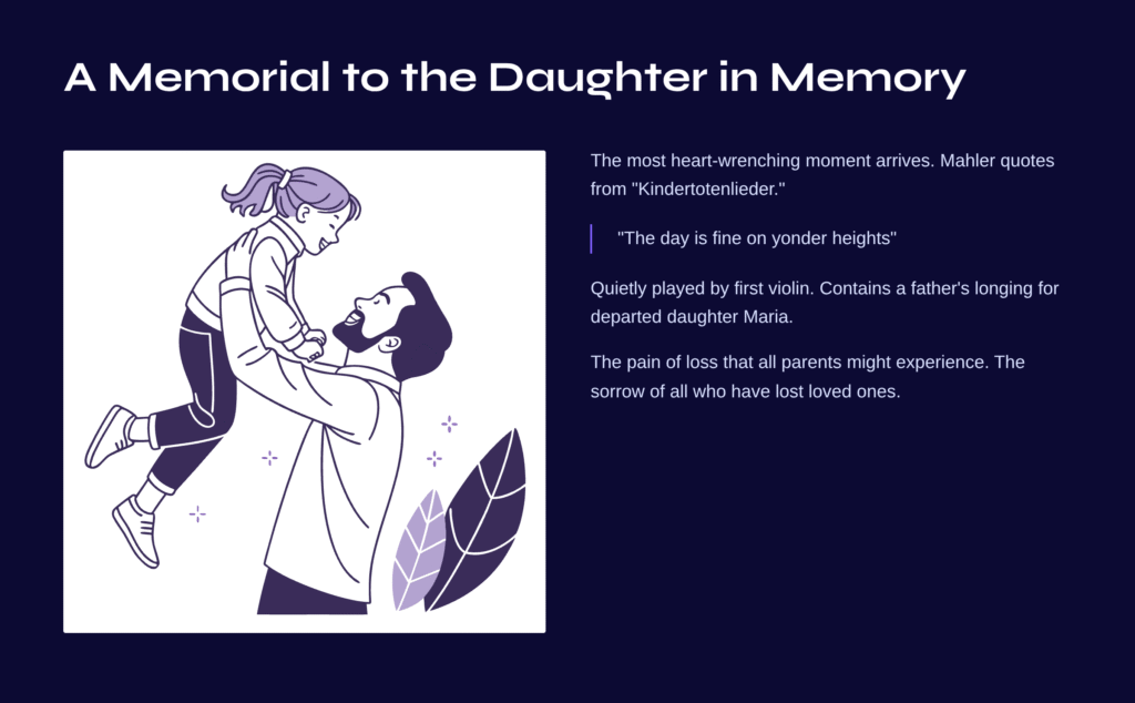 The most heart-wrenching moment comes when Mahler quotes a melody from his own song cycle “Kindertotenlieder (Songs on the Death of Children).” The melody of “The day is fine on yonder heights,” quietly played by the first violin, contains a father’s longing for his departed daughter Maria.