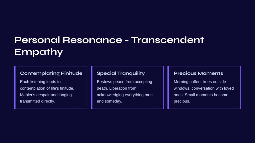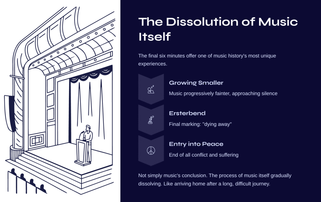 This is not simply the conclusion of music. It is the process of music itself gradually dissolving. A few string sounds, a solitary high violin left alone, the faint resonance of the final horn… all of this depicts the process of life quietly extinguishing.