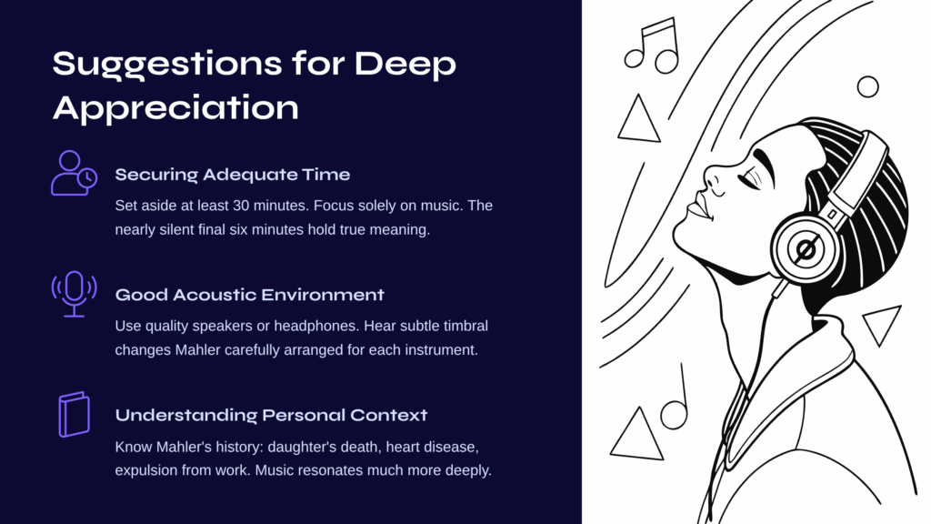 If you listen while knowing Mahler’s personal history—his daughter’s death, his own heart disease diagnosis, his expulsion from work—the music will resonate much more deeply. This is not abstract music, but a confession containing one human being’s desperate feelings.