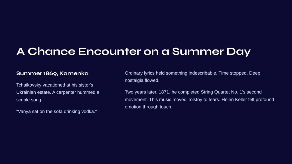 Two years later, in 1871, he completed the second movement of his String Quartet No. 1 based on this folk song. This music would later move Tolstoy to tears, give Helen Keller a tactile experience of profound emotion, and continue to touch countless hearts to this day as an immortal melody.