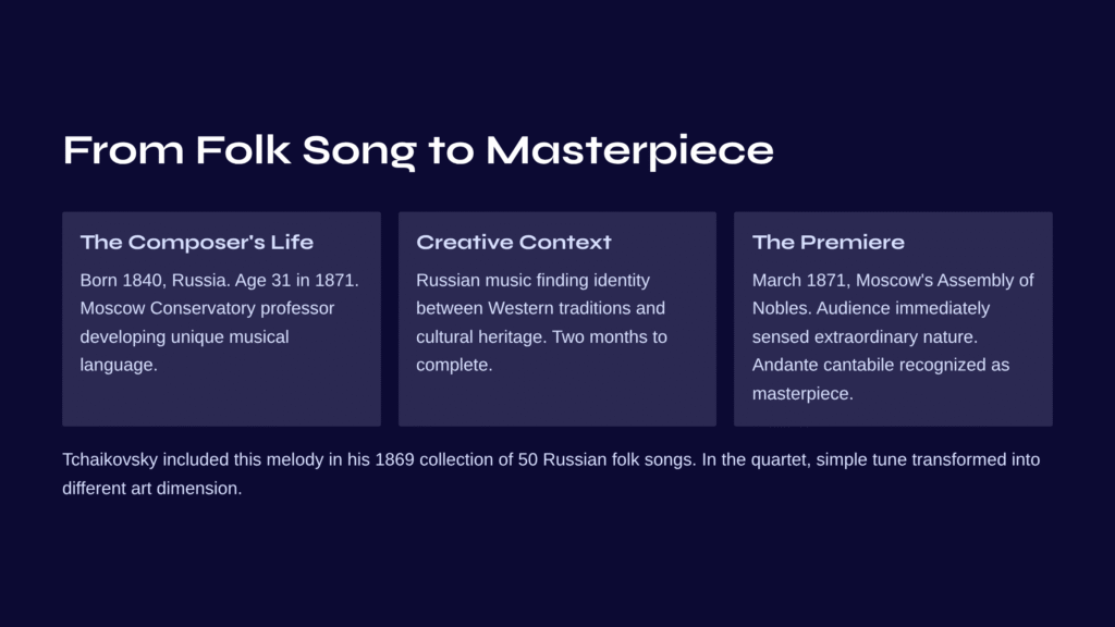 Tchaikovsky had already included this folk melody in his 1869 collection of 50 Russian folk songs for piano duet. However, in the string quartet, that simple tune was transformed into an entirely different dimension of art—not merely an arrangement, but a new creation based on the folk song’s emotional essence.