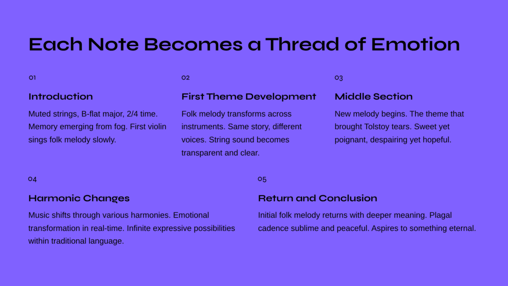 Then suddenly, the first violin begins singing an entirely new melody. This is that famous theme—the very melody that brought tears to Tolstoy’s eyes.