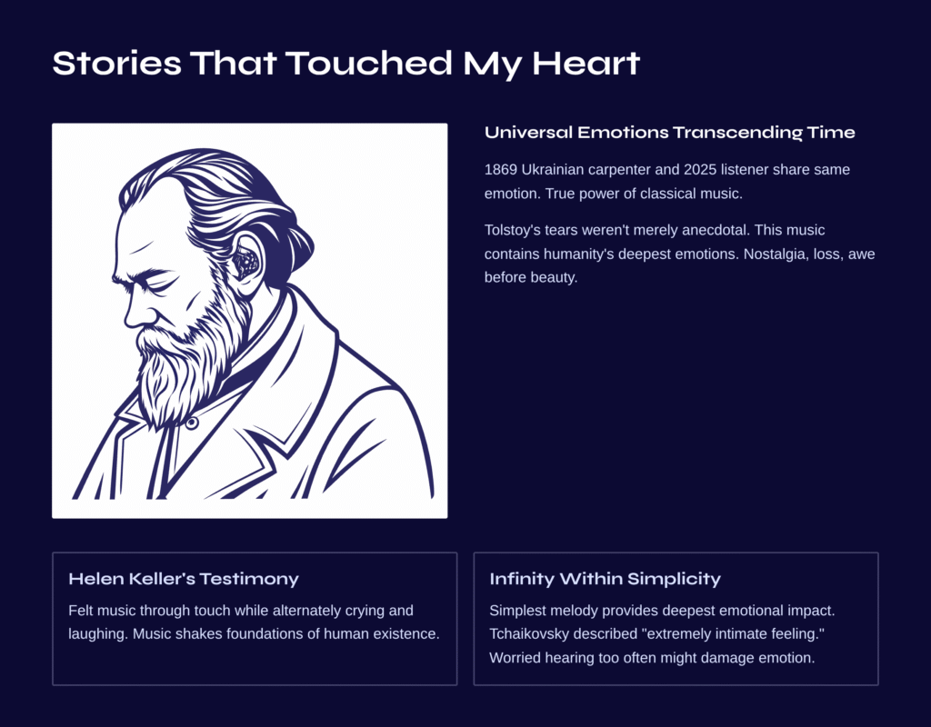 Helen Keller’s testimony about feeling this music through touch while alternately crying and laughing is equally significant. It demonstrates music’s power to move beyond simple auditory experience and shake the very foundations of human existence.