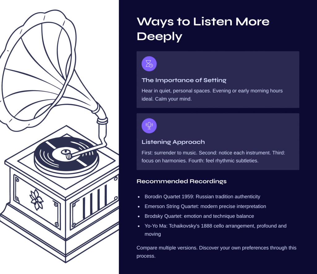 The Borodin Quartet’s 1959 recording best demonstrates the authenticity of Russian tradition. The Emerson String Quartet offers modern yet precise interpretation, while the Brodsky Quartet shows excellent balance between emotion and technique.