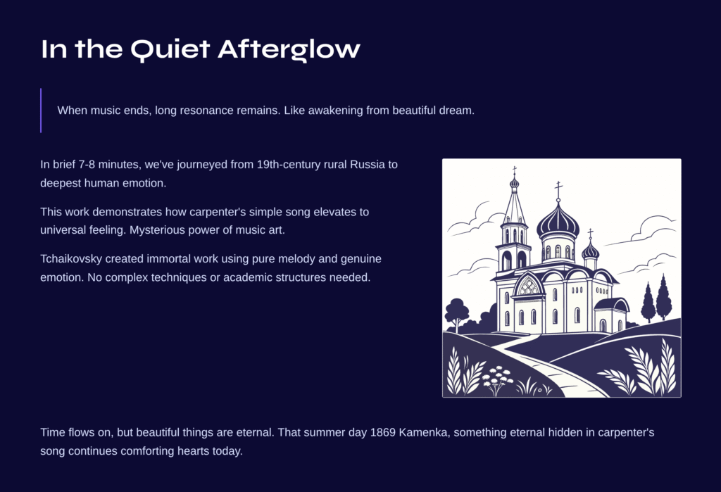 This work perfectly demonstrates how a carpenter’s simple song can be elevated to universal human feeling, and what mysterious power the art of music possesses. Tchaikovsky created an immortal work using pure melody and genuine emotion instead of complex techniques or academic structures.