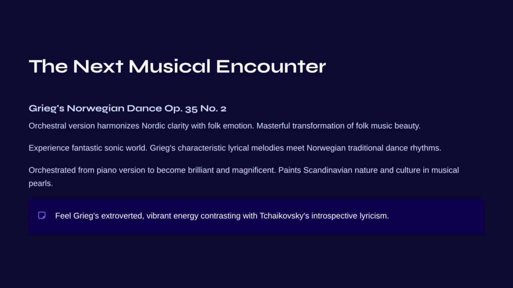 If you were moved by Tchaikovsky’s lyrical beauty, I recommend next exploring Grieg’s Norwegian Dance Op. 35 No. 2 (orchestral version).