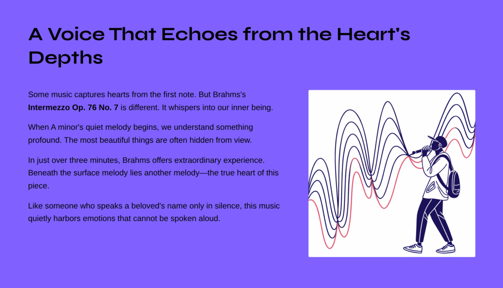 Some music captures our hearts from the very first note. But Brahms’s Intermezzo Op. 76 No. 7 is different. This piece doesn’t announce itself on the surface; instead, it whispers its way into our inner being. The moment A minor’s quiet melody begins to flow, we understand something profound: the most beautiful things are often hidden from view.