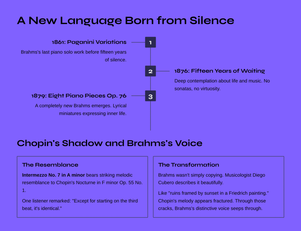 After the Paganini Variations Op. 35 in 1861, Brahms didn’t write a single piano solo work for an astonishing fifteen years. When the silence was finally broken in 1879 with the Eight Piano Pieces Op. 76, it revealed a completely new Brahms. No longer did he pursue the grandeur of sonatas or the brilliant virtuosity of variations. Instead, he turned toward a world of lyrical miniatures that honestly expressed his inner life.