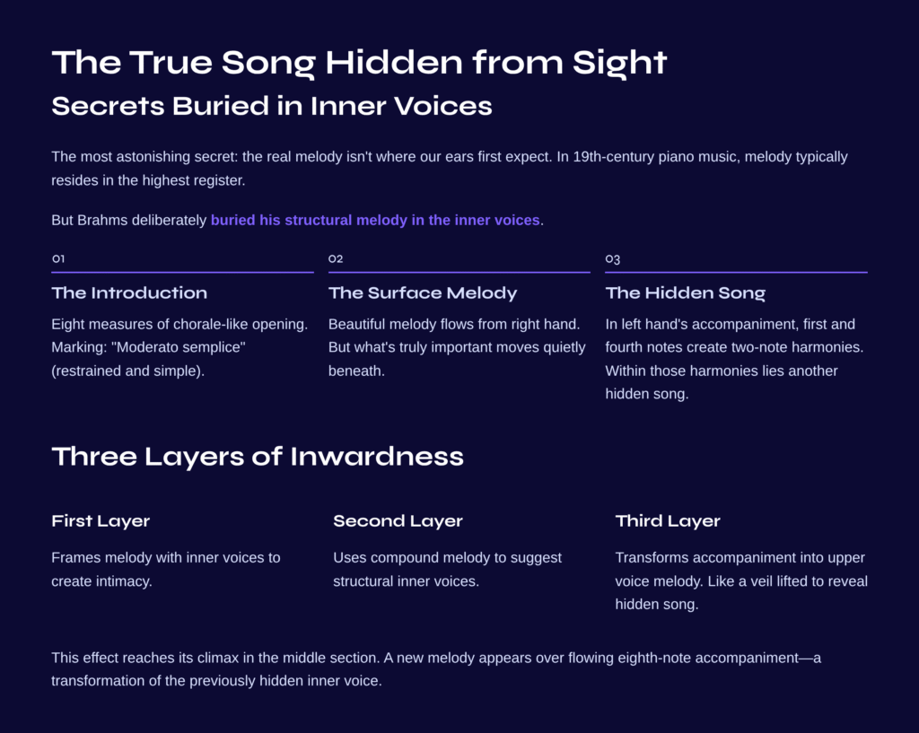The most astonishing secret of this Intermezzo is that the real melody isn’t where our ears first expect to find it. In 19th-century piano music, melody typically resides in the highest register—the top line of the right hand. But Brahms deliberately buried his structural melody in the inner voices.